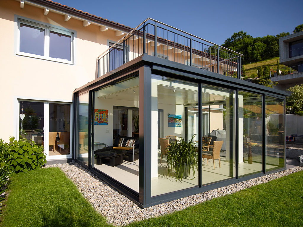 Der kleine Balkon der Familie I wurde durch eine Walmdachverglasung auf drei Seiten erweitert, sodass ein stilvoller, isolierverglaster Wintergarten entstand. Die Balkonuntersicht wurde mit Holz verkleidet und weiß gestrichen, während helle Fliesen dem Innenraum eine freundliche, mediterrane Atmosphäre verleihen. So entstand eine kleine Oase, die rund drei Viertel des Jahres genutzt werden kann – ideal zum gemütlichen Essen oder entspannten Verweilen.