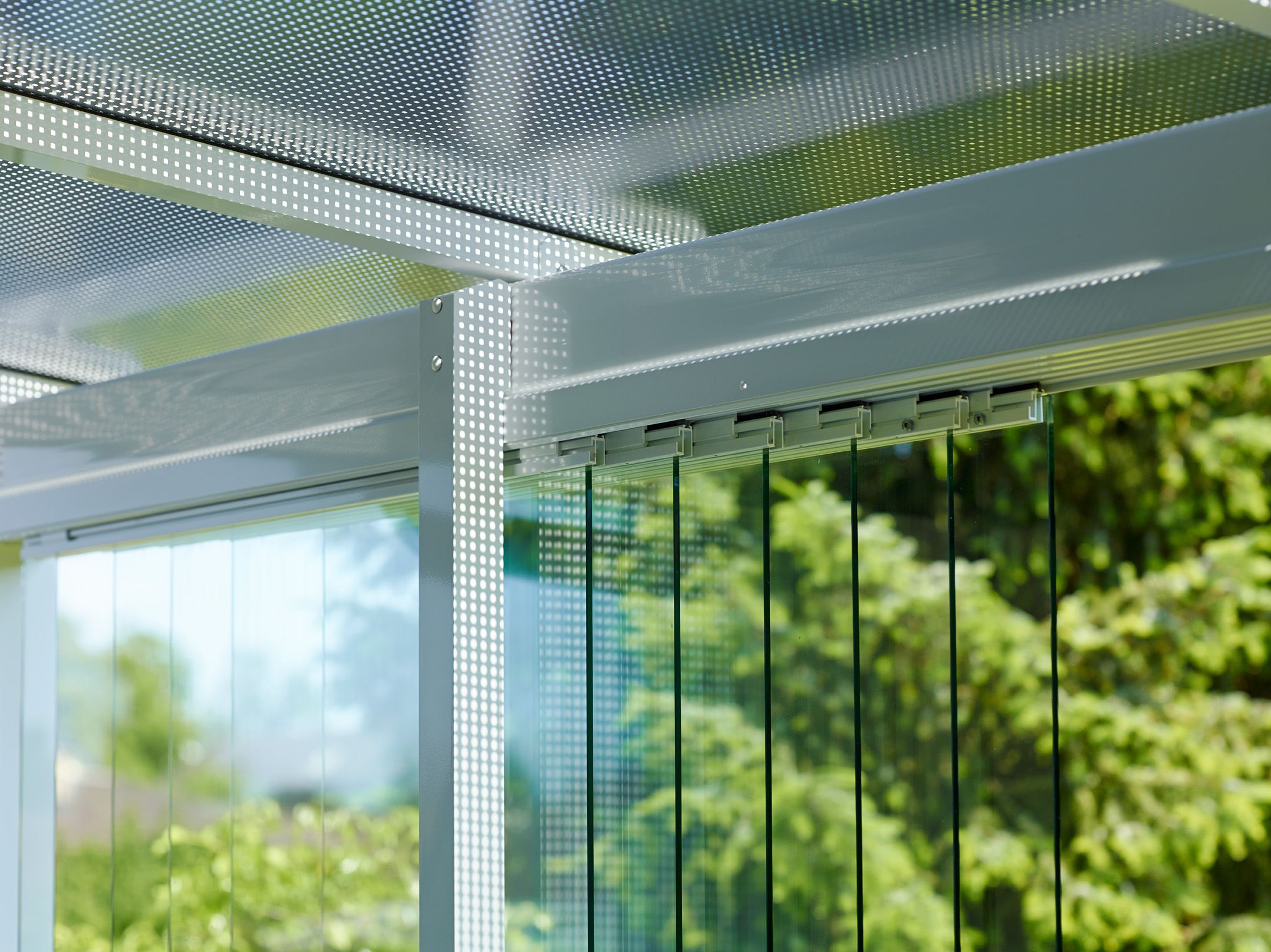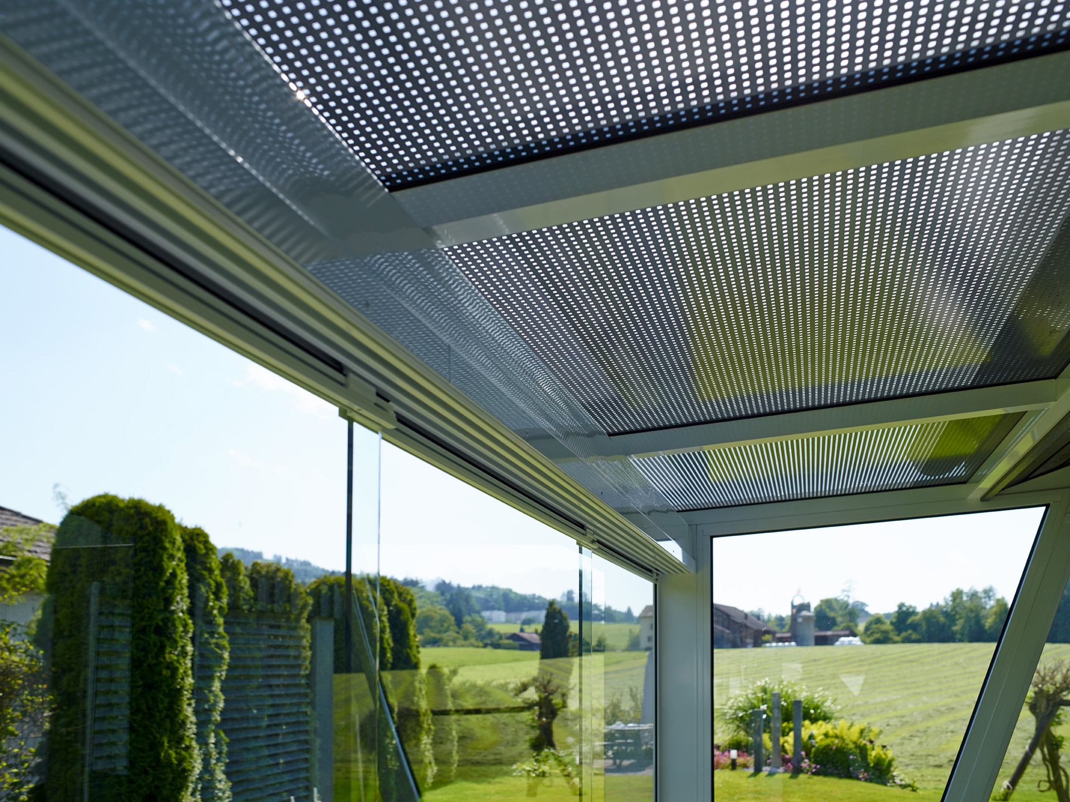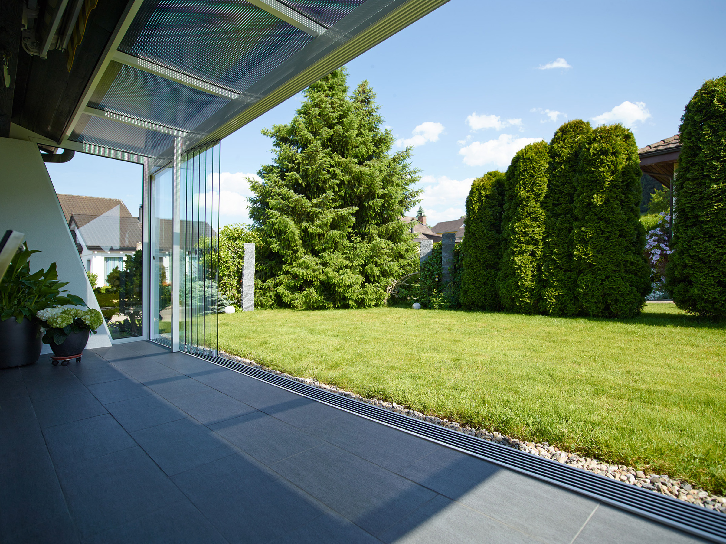 Familie H hat sich den Traum eines einfachverglasten Wintergartens erfüllt, indem eine kleine Dachverglasung an das bestehende Flachdach angebaut wurde. Die Front des Wintergartens ist mit einfachverglasten Schiebeanlagen ausgestattet, während die seitlichen Fixverglasungen in eleganten Sonderformen mit Rahmen ausgeführt wurden. Anstelle einer klassischen Beschattung wurde ein Siebdruckglas für das Dach verwendet, das nicht nur vor Sonneneinstrahlung schützt, sondern auch ein faszinierendes Lichtspiel erzeugt. Der Schieferfliesenboden im Innenbereich sorgt für eine moderne und zeitlose Ausstrahlung.