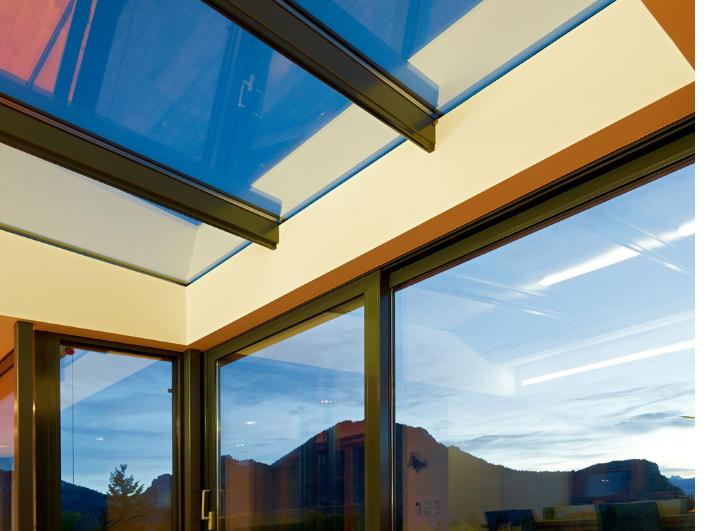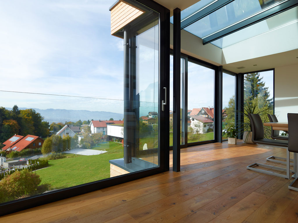Die komplette Vorderseite des Einfamilienhauses der Familie A wurde abgetragen und durch einen modernen Holzanbau mit Dach- und Senkrechtverglasung von Alu-Glas-Technik ersetzt. Die Wohnraumverglasungen lassen sich über großzügige Hebe-Schiebe-Anlagen (gesichert über absturzsichernde Glaselemente) sowie Dreh-Kipp-Fenster öffnen. Diese architektonische Aufwertung schafft eine beeindruckende Verbindung zwischen Innenraum und Landschaft und ermöglicht einen freien Blick auf den traumhaften Ausblick der Familie. Das Glasgeländer auf der Terrasse, ausgeführt mit rückversetzten Stehern, unterstreicht den geradlinigen, modernen Charakter des Neubaus.