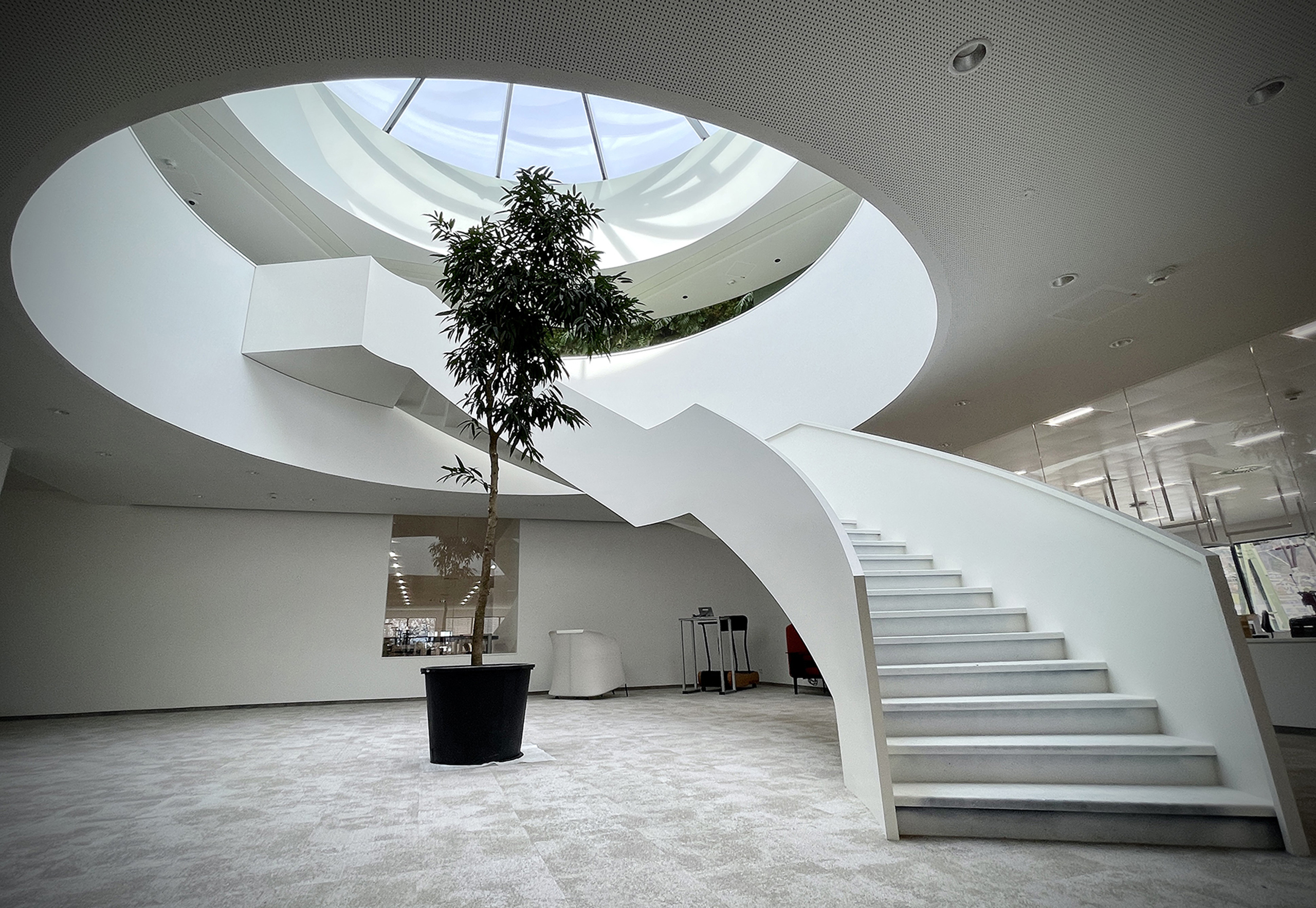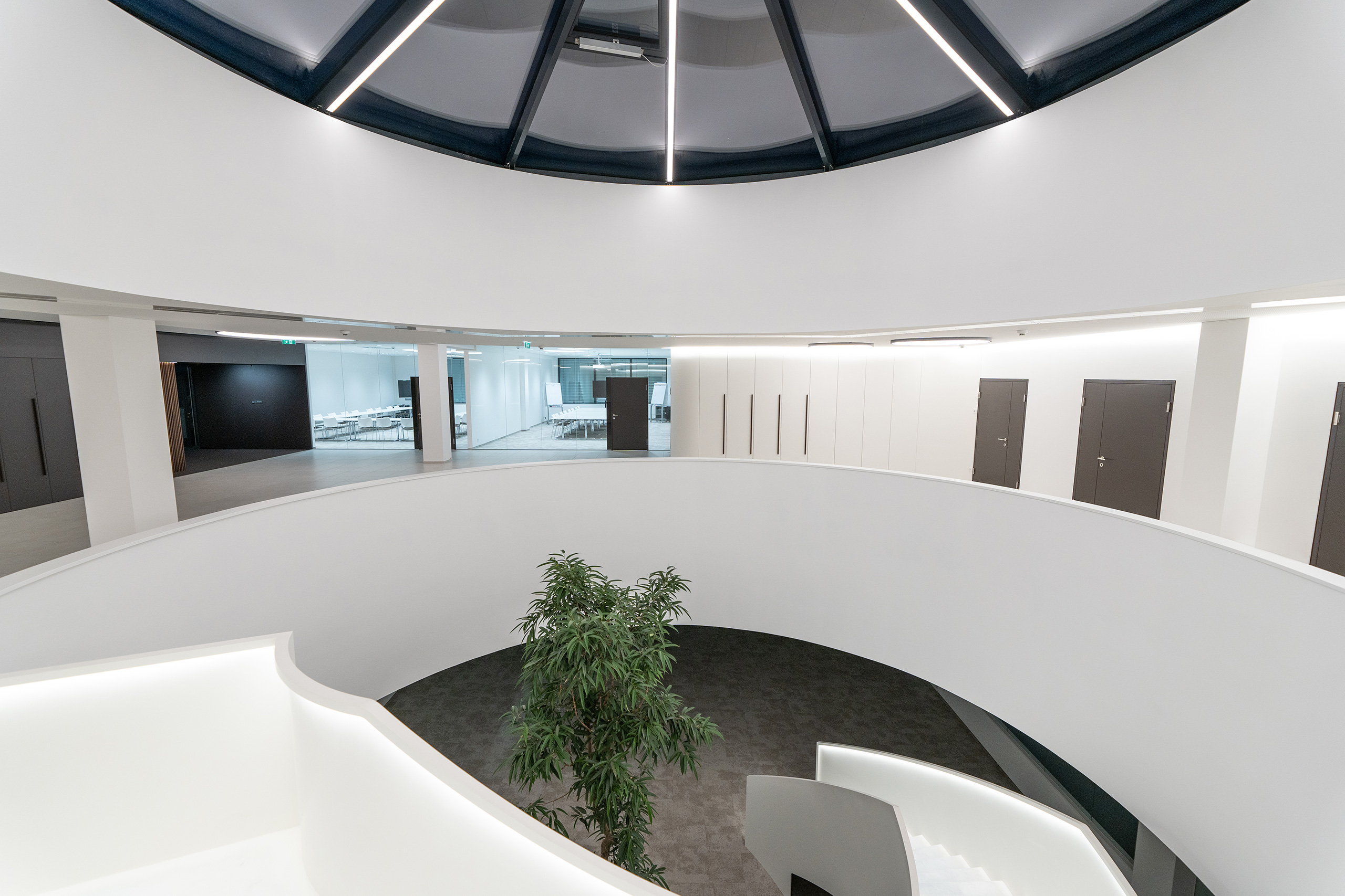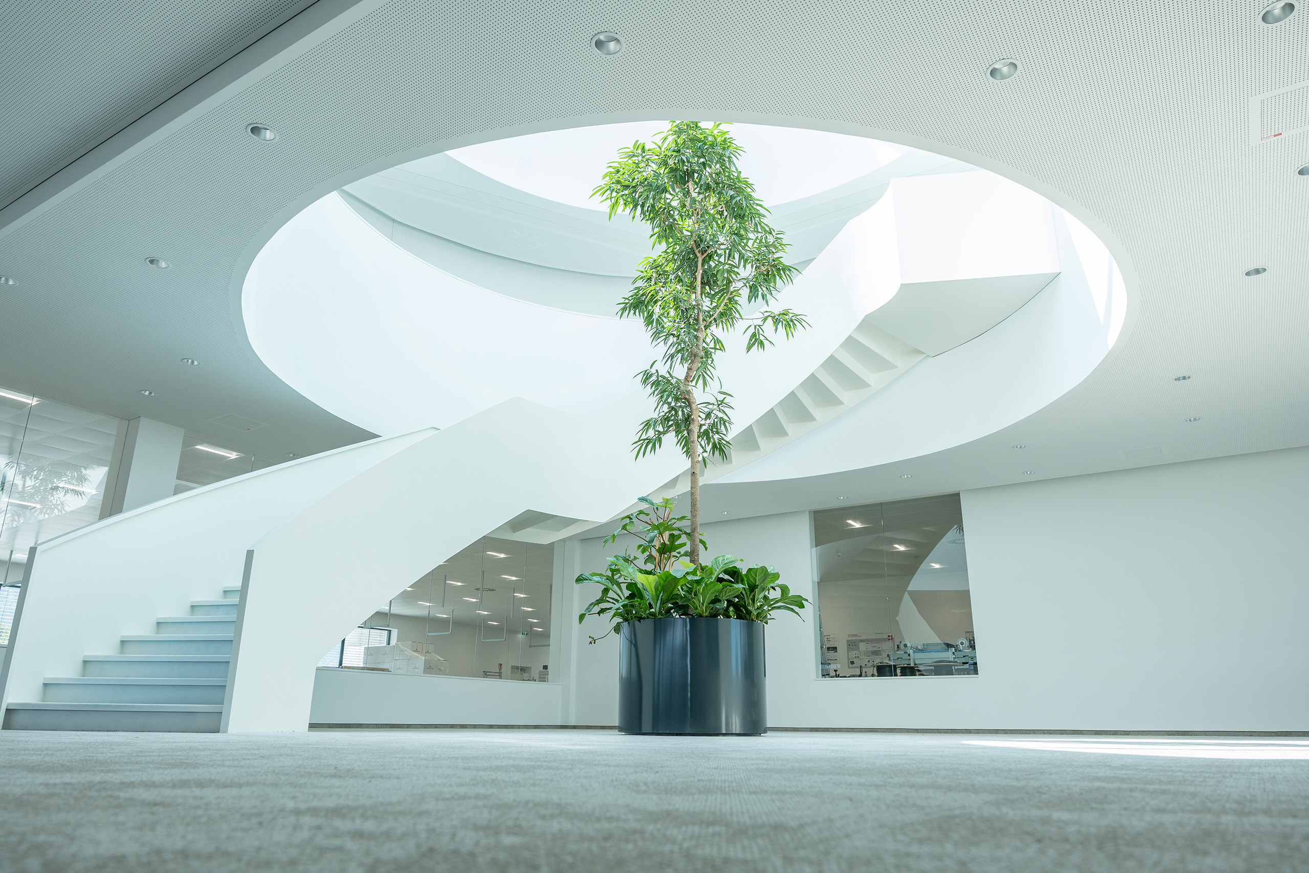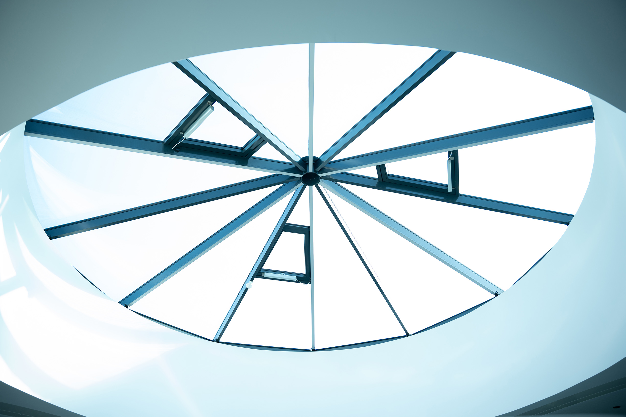 Für die Firma Heron realisierten wir anspruchsvolle Glaskuppeln in Pyramidenform – konstruktiv eine tolle Herausforderung, die wir mit unserem eigenen Profilsystem perfekt umsetzen konnten. Ergänzend sorgen motorisierte Dachklappen für eine effiziente Lüftung und zusätzlichen Komfort.