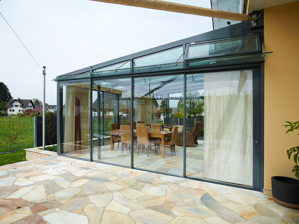Der ¾-Jahres-Wintergarten der Familie H beeindruckt durch seine großzügige Gestaltung. Er wurde an der Seite einer weitläufigen Terrasse errichtet, die keinen direkten Zugang zum Wohnhaus bietet, sodass die gegenüberliegende Seite weiterhin als offene Terrasse genutzt werden kann. Um einen geschützten Übergang zum Wintergarten zu gewährleisten, wurde eine elegante, abgehängte Vordachverglasung integriert, die trockenen Fußes den Zugang ermöglicht.