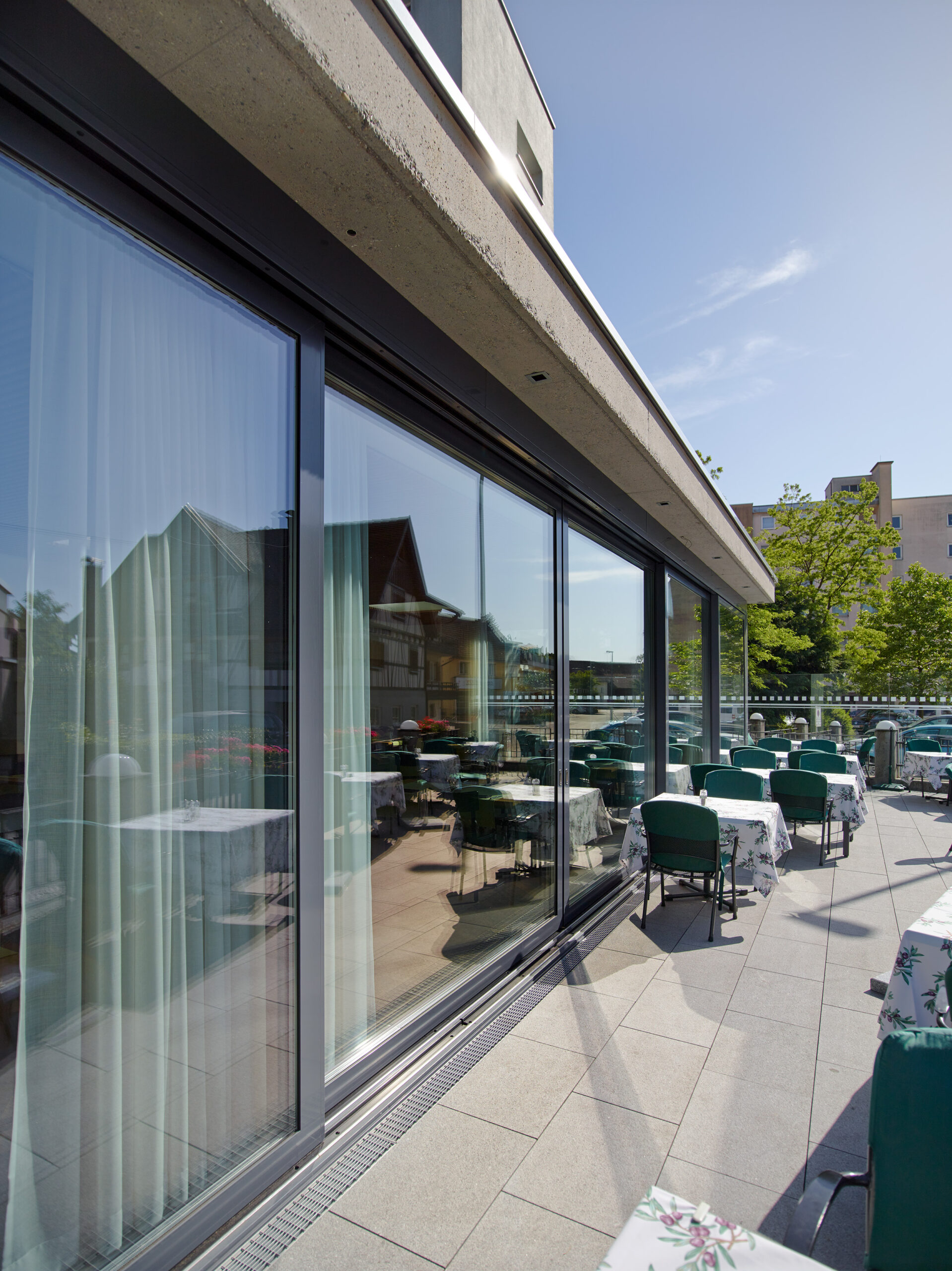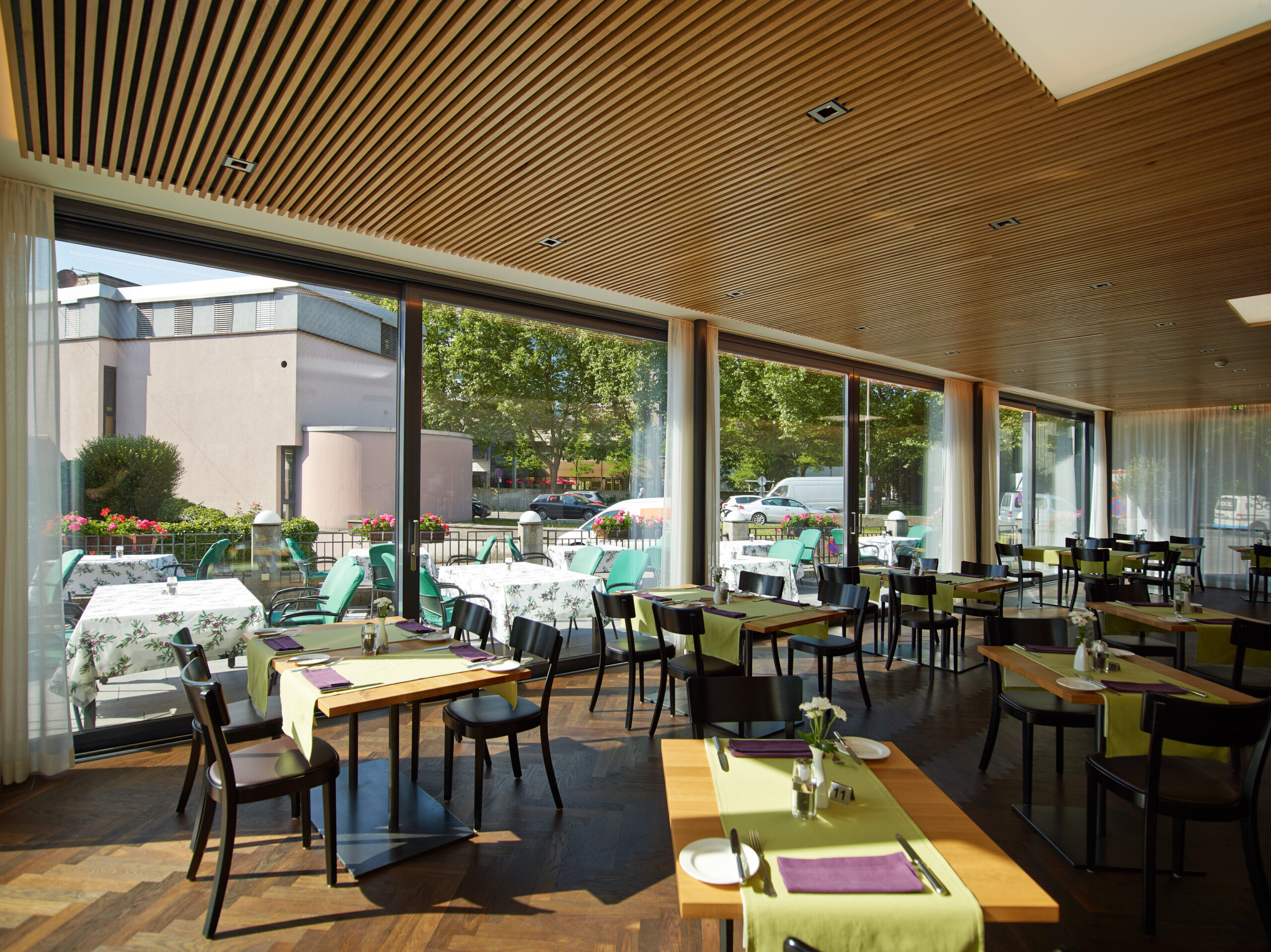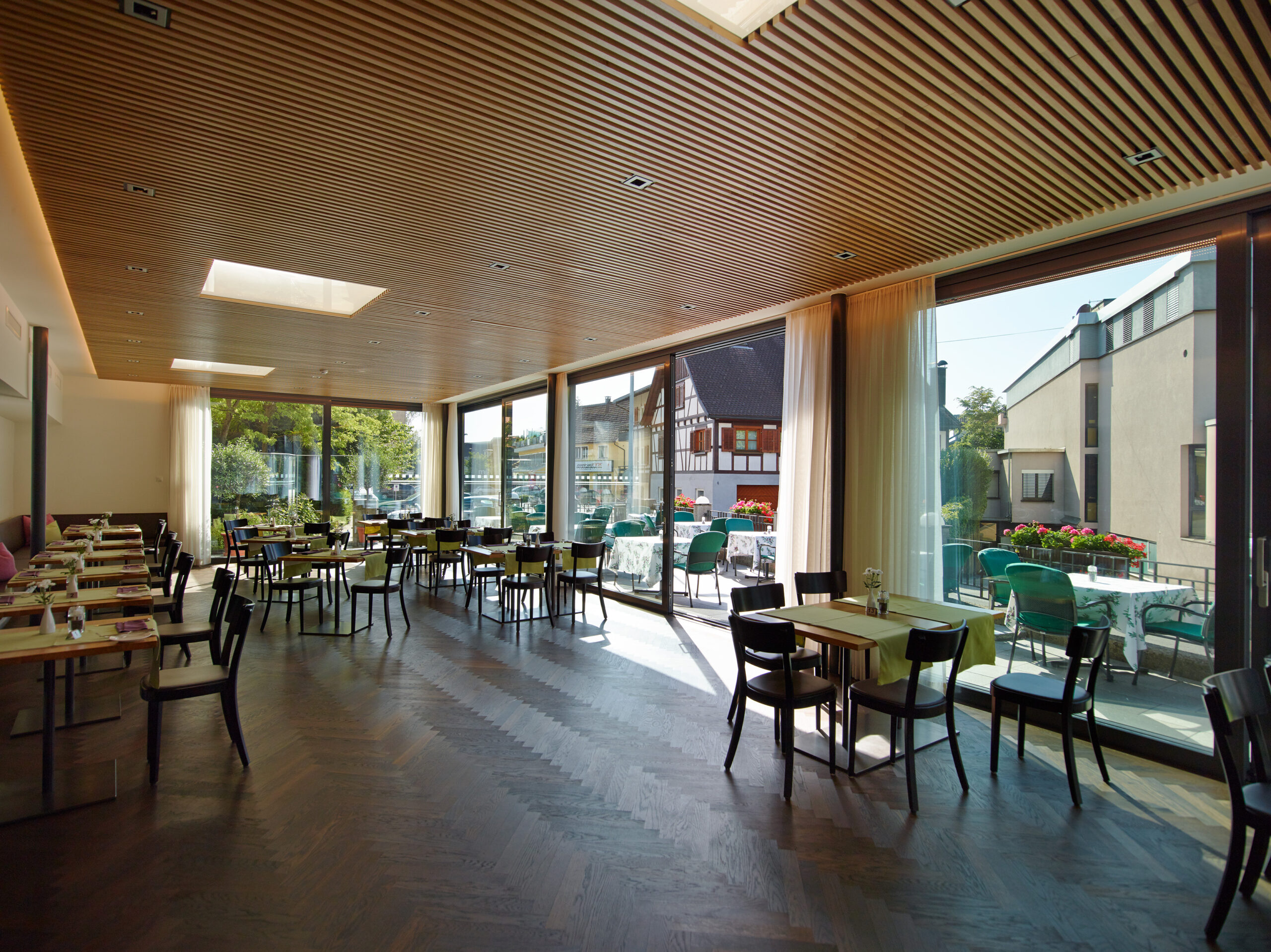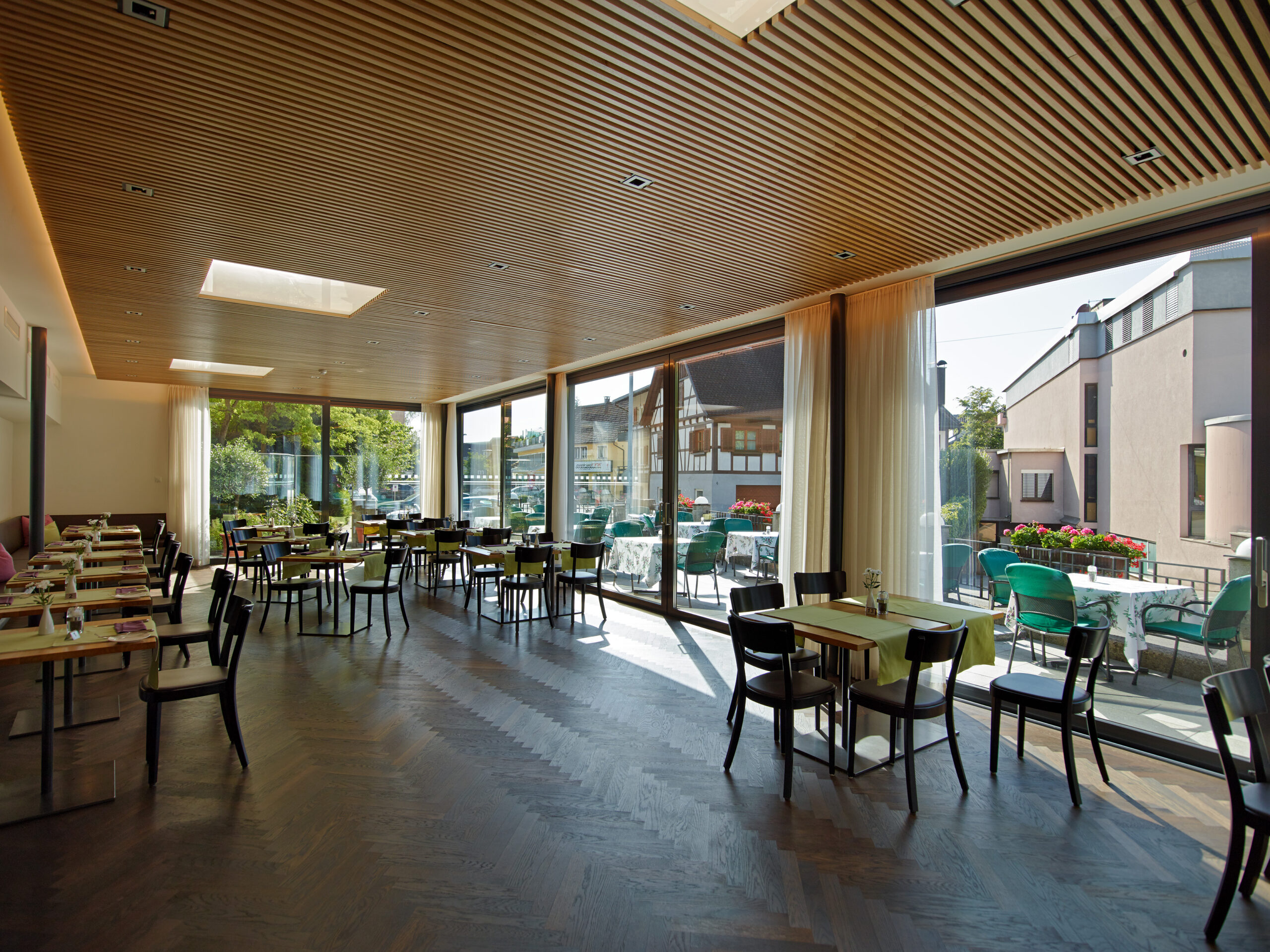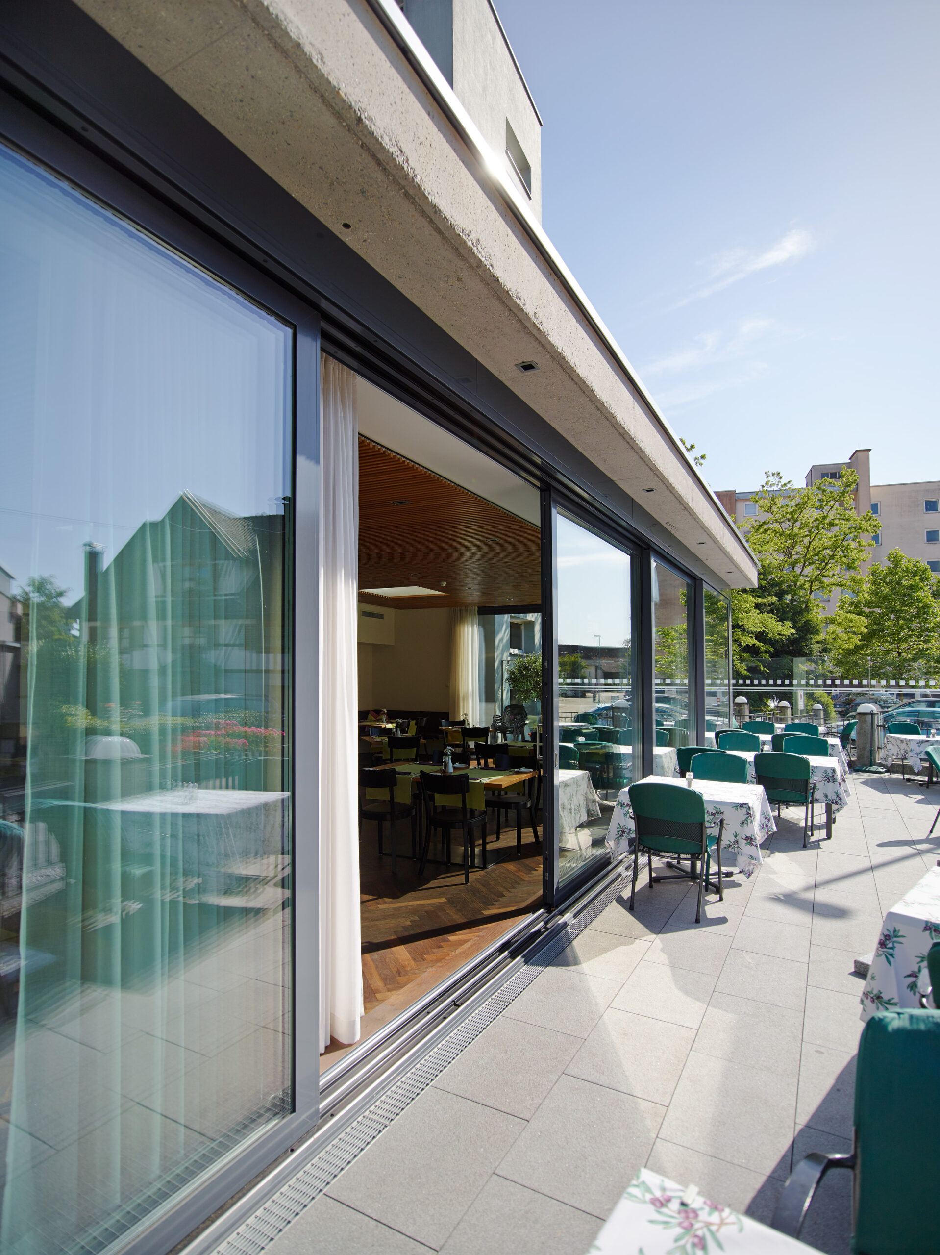 Das Hotel Krone in Dornbirn hat seinen Gastraum durch einen stilvollen Wohnraumwintergarten erweitert. Ein Teil der großzügigen Terrasse wurde überdacht und rundum verglast, während die verbleibende Außenfläche über eine große Hebe-Schiebeanlage zugänglich bleibt. Der Wintergarten besticht durch einen eleganten Parkettboden im Fischgrätmuster und wurde durch gezielte Wanddurchbrüche harmonisch in das bestehende Hotel integriert. Eine hochwertige Holz-Akustikdecke sorgt trotz der großen Glasflächen für eine angenehme Raumakustik – selbst bei lebhaftem Betrieb. So können Gäste ihre Mahlzeiten zu jeder Tageszeit geschützt genießen und gleichzeitig die Verbindung zur Natur spüren.