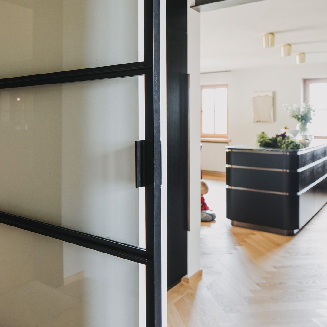 Beim Umbau des Einfamilienhauses Amann-Thurner war das Ziel, den Industrial-Style bei den Raumabtrennungen aufzugreifen. Dies ist sowohl mit einer wunderschönen, funktionalen Schiebetür als Abtrennung zwischen Küche und Gangbereich gelungen als auch mit einer Tür zwischen Weinkeller und Garderobenbereich. So gewinnen die Türelemente an Stil, ohne Licht zu verlieren. Das bringt eine klare Aufwertung der Wohnräume und Funktionalität für die Familie.